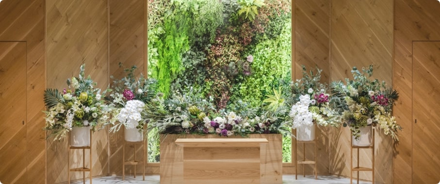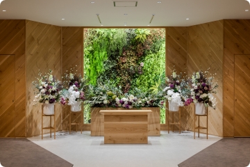 木と緑をふんだんに使ったここにしかない空間こそふわりの最大の特徴です。祭壇奥の緑壁は『永遠の緑(エターナルグリーン)』と呼ばれ、あえてアーティシャルフラワー(造花)を使用しております。これは、枯れない花=「色褪せることない故人様との思い出」の象徴と考え、大切な思い出とともに故人様をお見送りいただきたいという想いが込められております。ぜひ一度実物をご覧くださいませ。